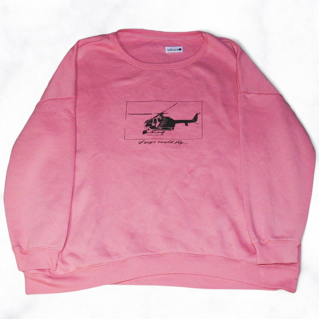 1 of 1 jumper with a hand screen printed ‘if pigs could fly’ graphic. Sakura woven label sewn onto inner neck.