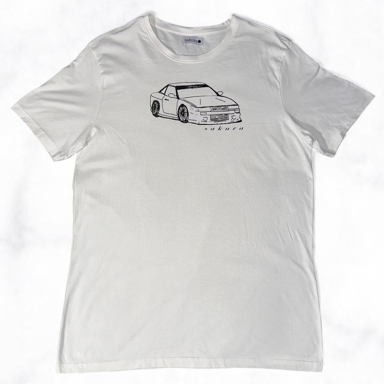 1 of 1 tee with a hand screen printed s13 JDM car. Sakura woven label sewn onto inner neck.