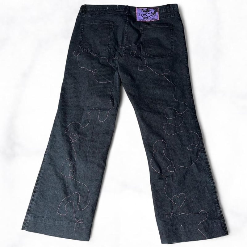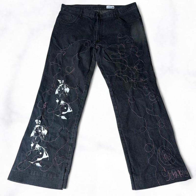 This piece is a 1 of 1 pair of relaxed fitting black jeans, customised with hand sewn pink contrast stitches in a squiggle pattern and hand printed anime designs on the right leg.
