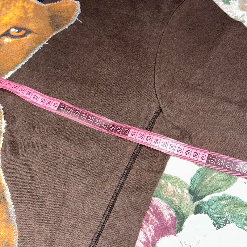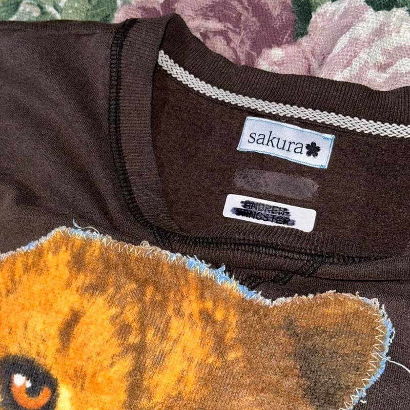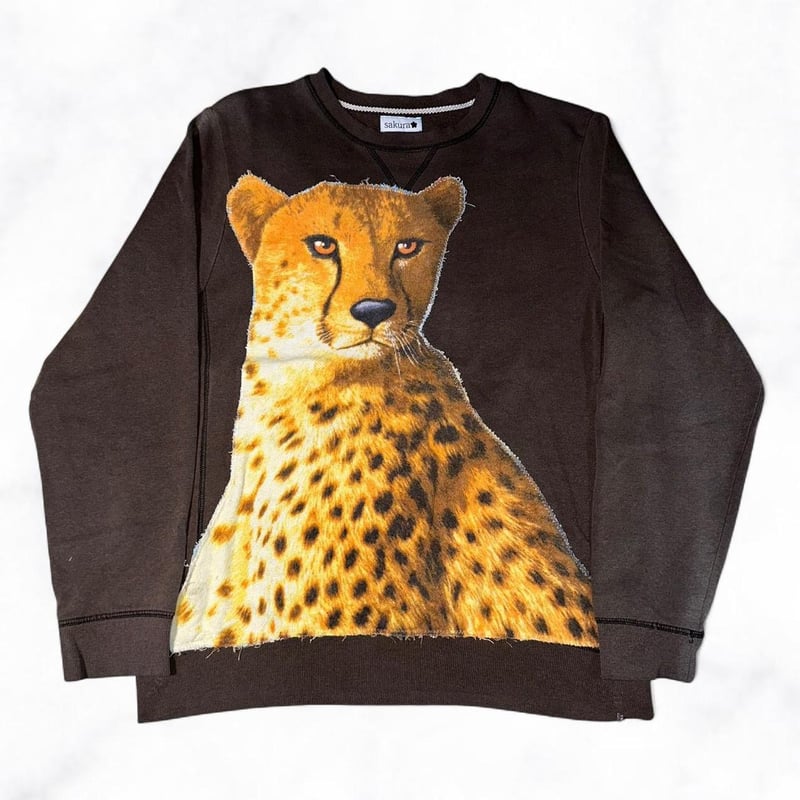 1 of 1 brown jumper customised with a large cut and sewn cheetah. Custom Sakura woven label sewn onto inner collar.