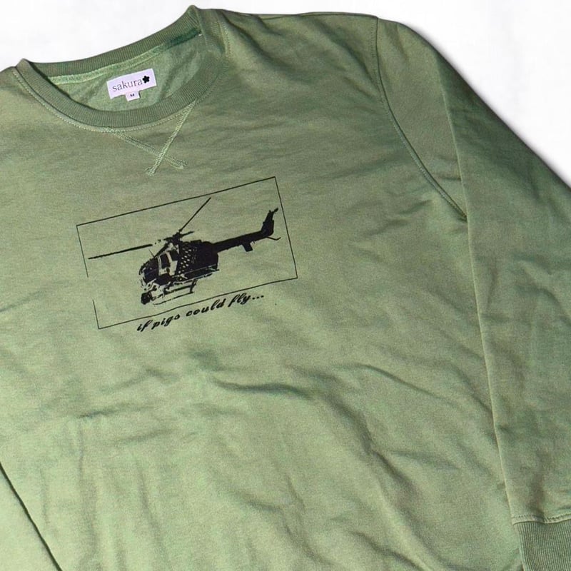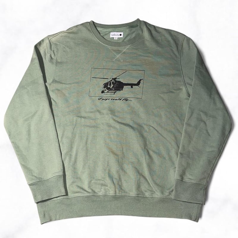 This piece is a 1 of 1 jumper customised with a hand screen printed ‘if pigs could fly’ graphic. Custom Sakura woven label sewn onto inner neck.