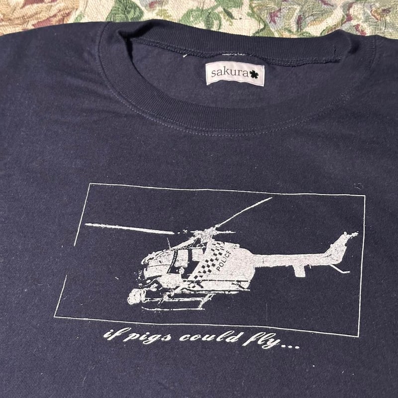 1 of 1 tee customised with a hand screen printed ‘if pigs could fly’ graphic. Custom Sakura woven label sewn onto inner collar.