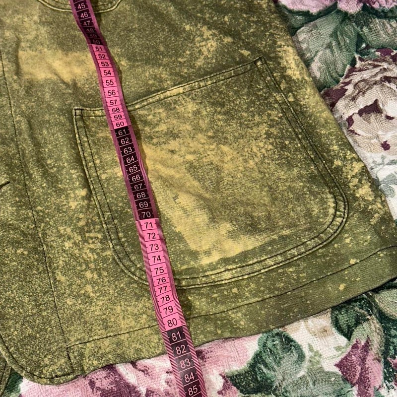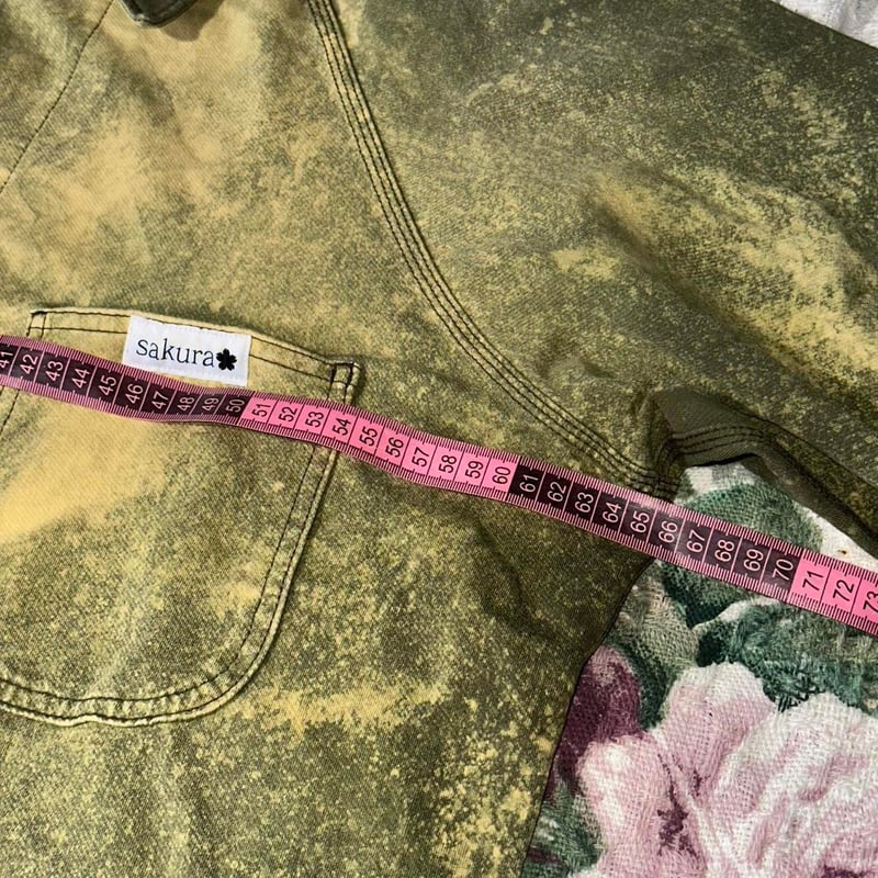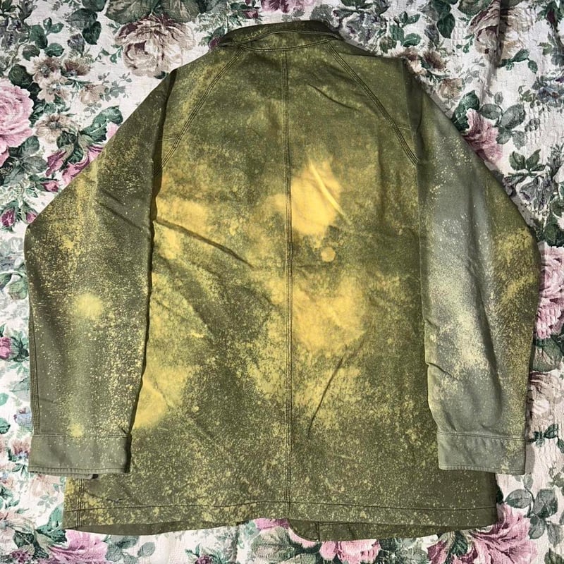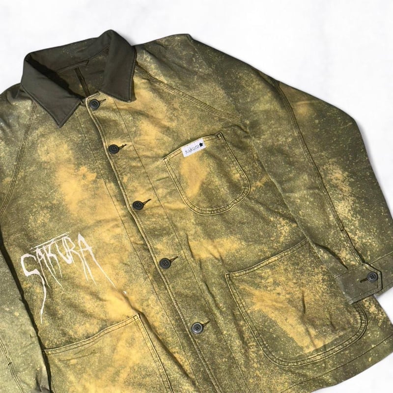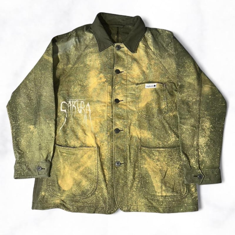 1 of 1 green jacket customised with a screen printed ‘death metal’ logo and bleach dyed. Custom Sakura woven label sewn onto upper pocket
